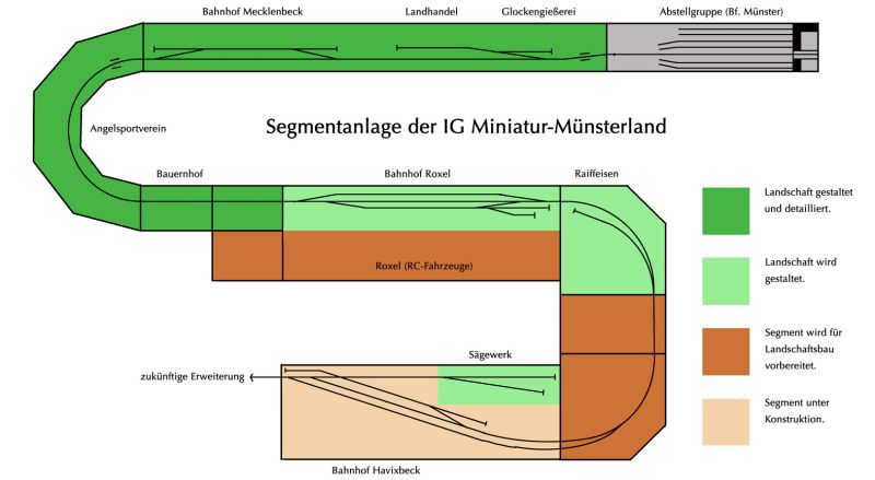 Inzwischen ist aus der mobilen ersten Ausstellungsanlage unsere stationäre Anlage geworden. Sie ist mittlerweile mehrmals überarbeitet und weiter detailliert worden. Der Endbahnhof Olfen wurde zum Durchgangsbahnhof Mecklenbeck. Die Strecke führt jetzt weiter zum Bahnhof Roxel und erreicht darauf den Bahnhof Havixbeck. Hier ist erstmal vorübergehend das Streckenende erreicht. Wenn alle Segmente ausgestaltet sind, wird in den nächsten Jahren die Strecke bis zum Bahnhof Coesfeld fortgeführt.