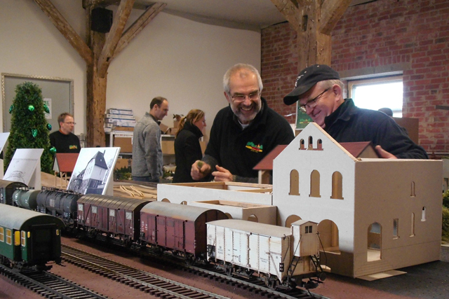 Unser neuer Bahnhof Roxel konnte seine Betriebsqualitäten als momentaner Endpunkt der Anlage beweisen. Die Ausgestaltung ist zur Zeit noch spärlich, aber die Laderampe und der Rohbau des Bahnhofsgebäudes gaben eine Vorstellung von dem zukünftigen Aussehen. Die auf Karton gezogenen Fotos vom ehemaligen Bahnhof halfen bei der Orientierung und regten zum Fachsimpeln an.